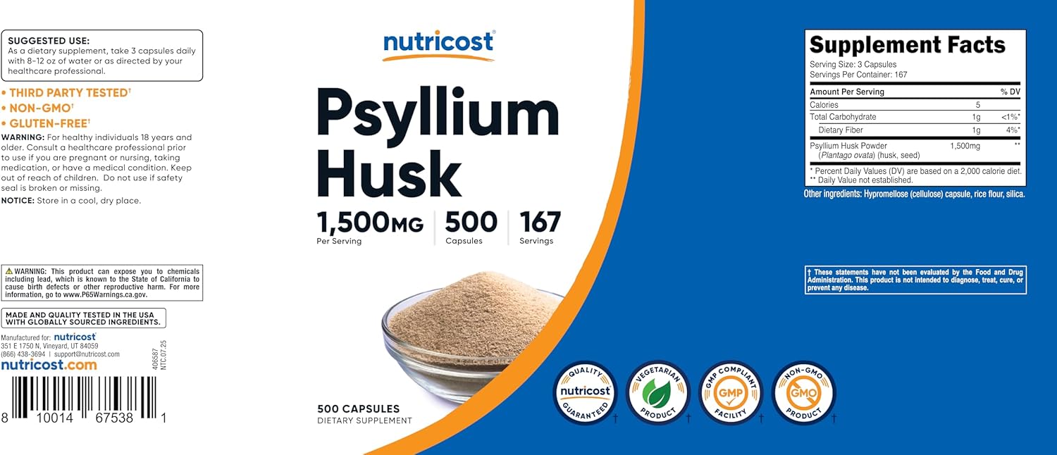 Nutricost Psyllium Husk 1500mg Per Serving, 500 Capsules - Non-GMO & Gluten Free