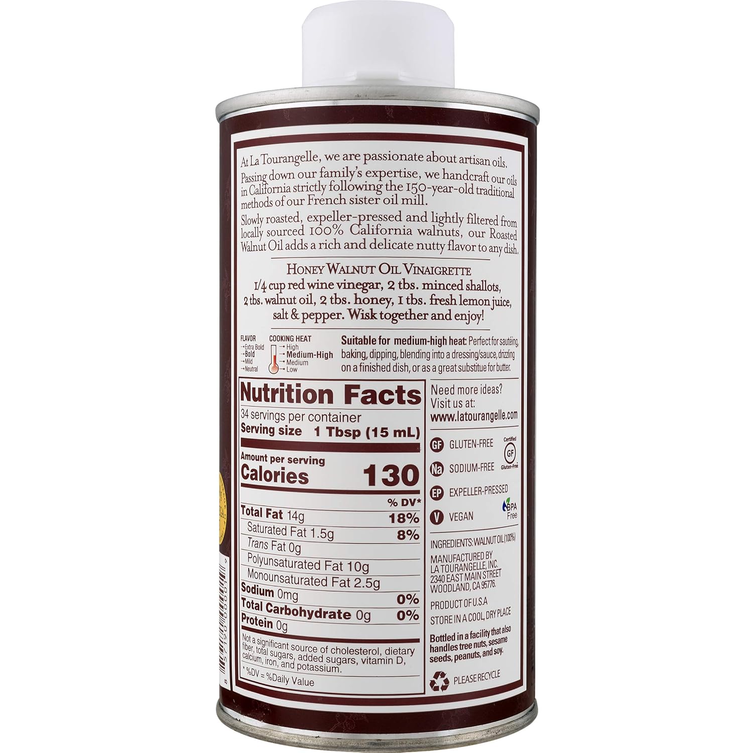 - Includes a 16.9 Fl Oz bottle of La Tourangelle Roasted Walnut Oil made from California walnuts and expeller-pressed; Adds rich, nutty flavor and 1.23g Omega-3 fatty acids per serving.