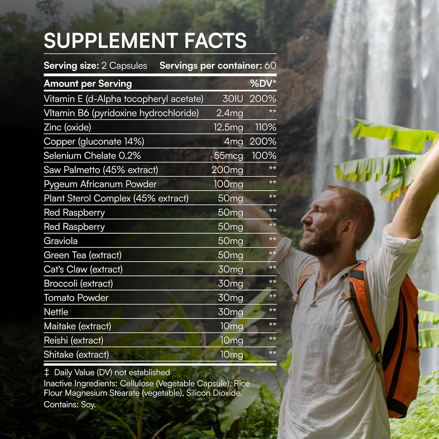 - HERBAL PROSTATE SUPPORT: This prostate support supplement is crafted with a thoughtful blend of saw palmetto, pygeum africanum and pumpkin seed to help maintain your wellness and vitality.