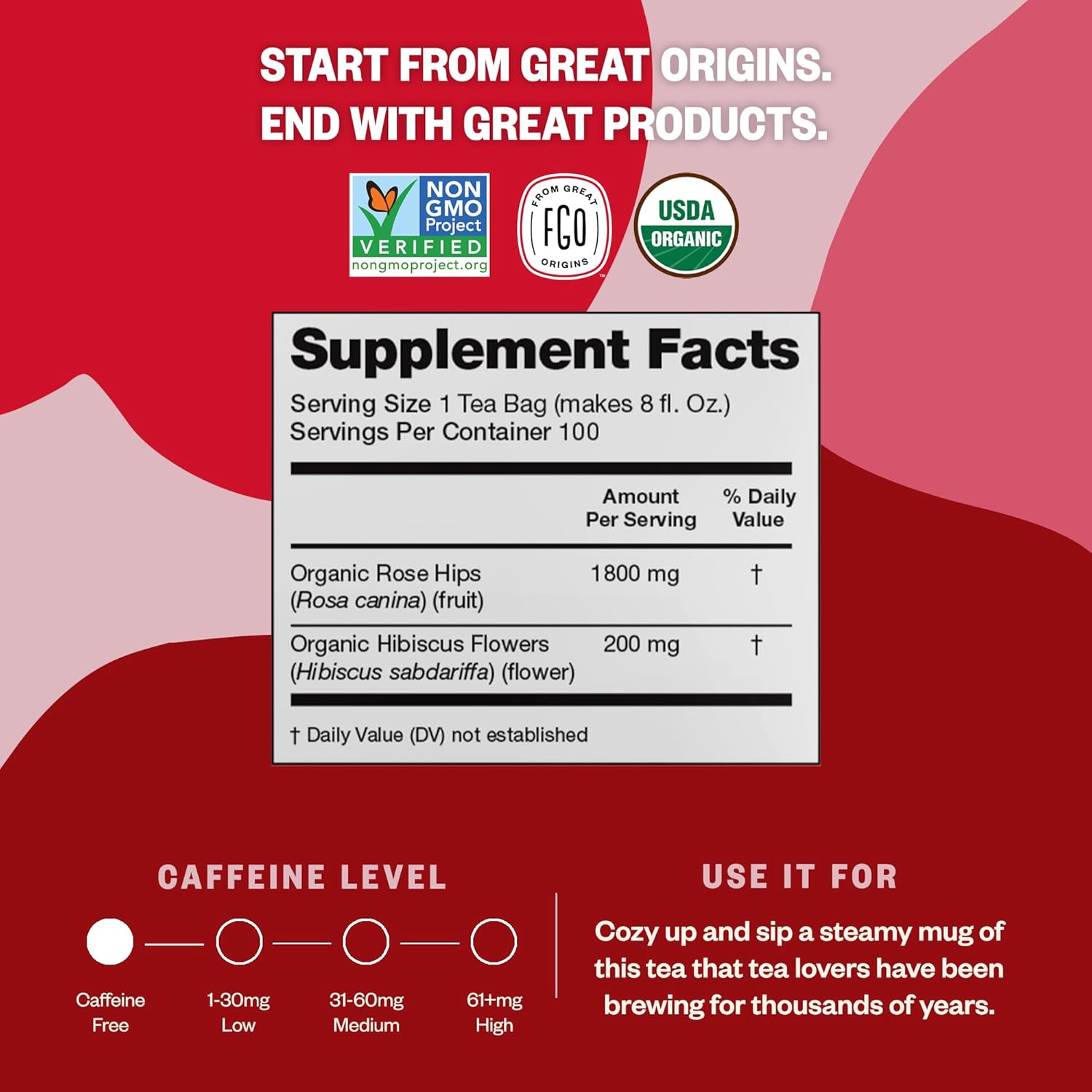 FGO Organic Rosehips Tea, Eco-Conscious Tea Bags, 100 Count, Packaging May Vary (Pack of 1)