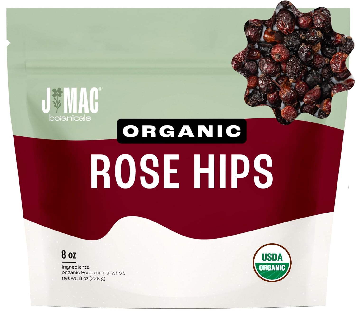 J MAC BOTANICALS Organic Rose Hips (8 oz Bag) Whole, natural organic dried rose hips for herbal tea, rosehips dried organic, rosehip tea, packaged in the USA