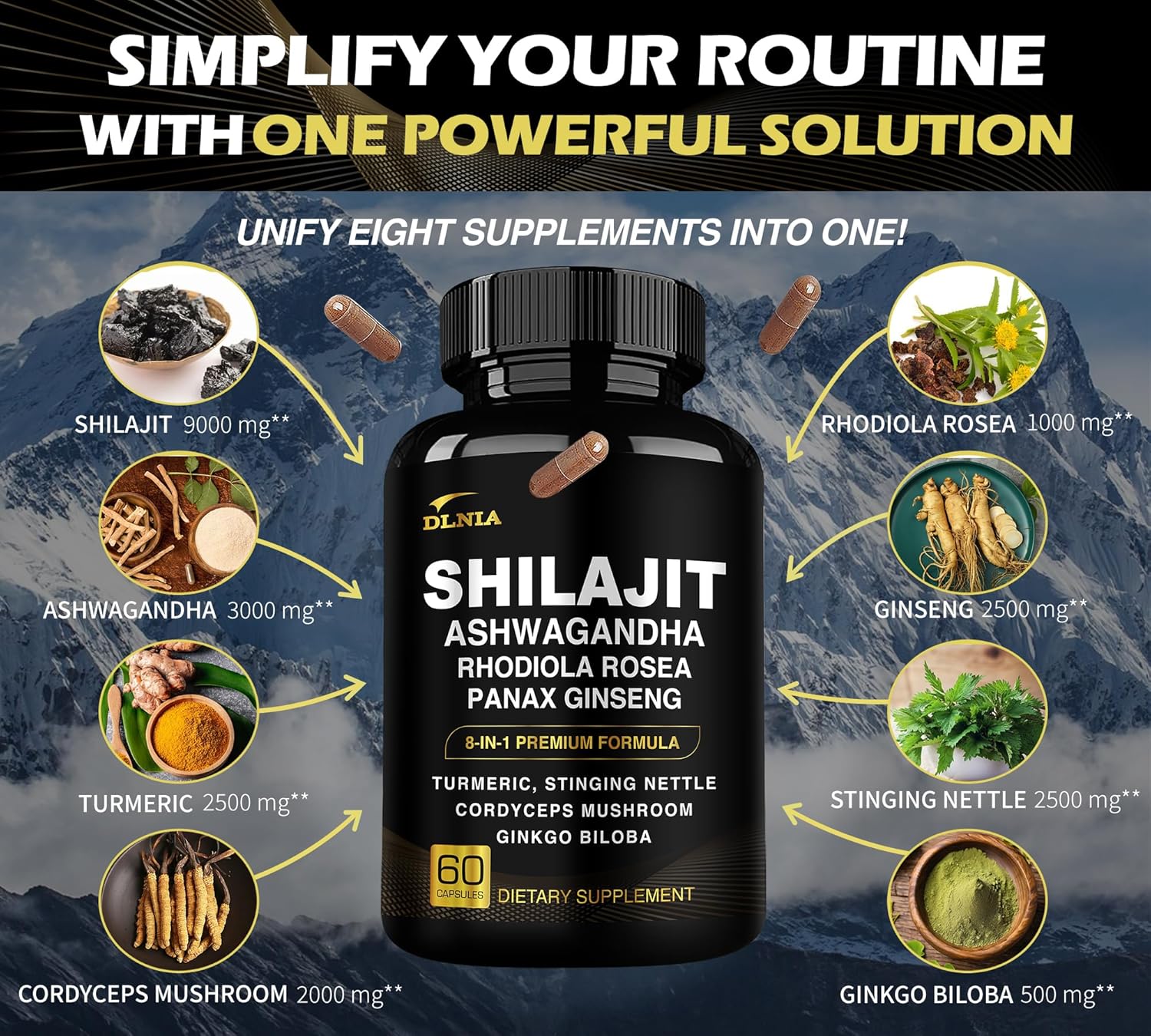 - 💪UNLOCK NATURE’S SECRET TO VITALITY: Experience an unparalleled boost in energy with our 8-in-1 Shilajit capsules for men & women; a curated blend of ancient Himalayan shilajit, Ginkgo Biloba, & Panax Ginseng stimulates your overall wellness, ensuring you power through your day with vigor & zest; The potent blend of Rhodiola rosea & Ashwagandha improves your overall wellness and cortisol management.