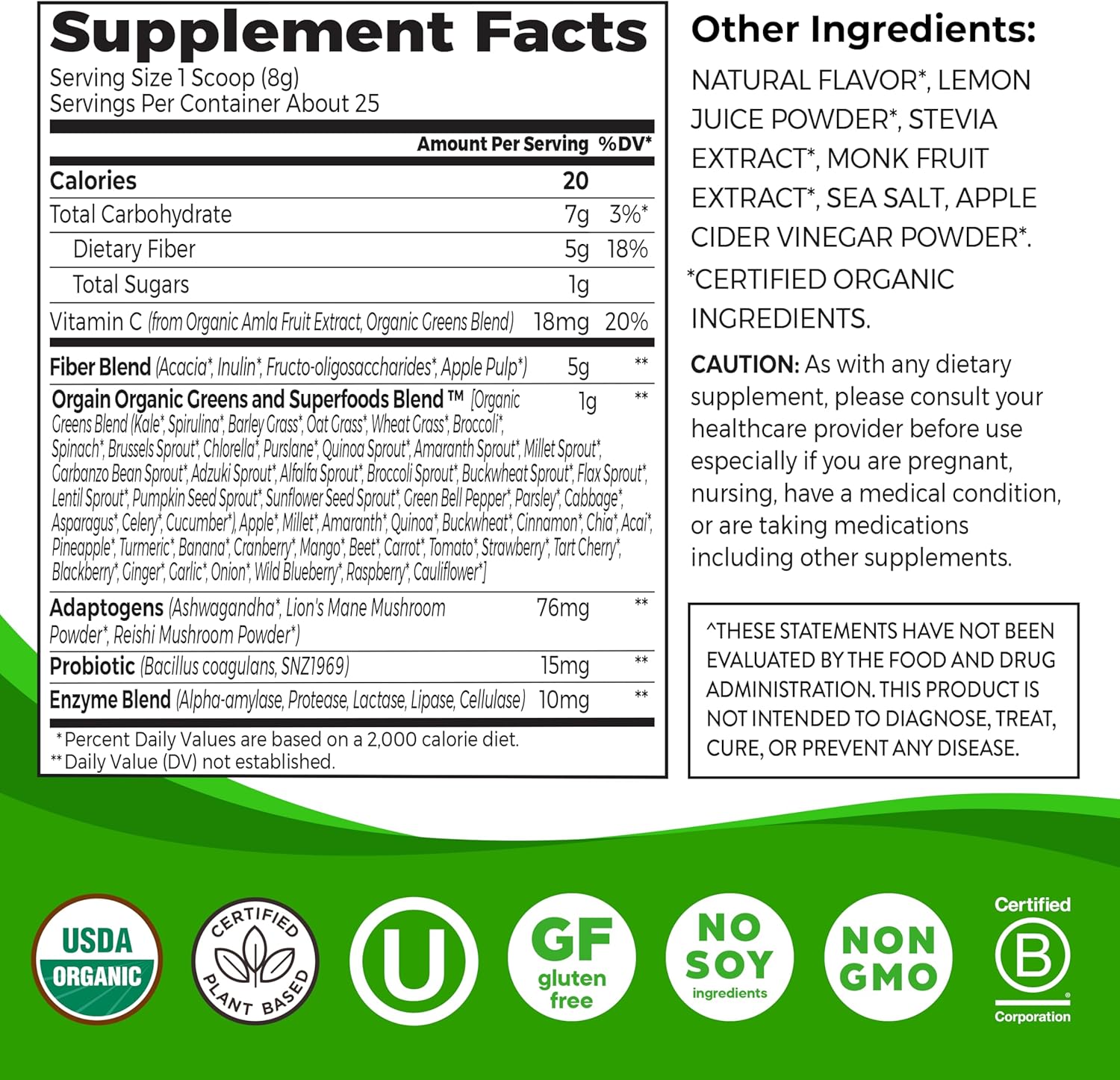 - CLEANER INGREDIENTS: Superfoods from ingredients such as organic ancient grains, berries, fruits, greens, grasses, veggies, herbs and sprouts. It also features probiotics to support gut health** and adaptogens from ashwagandha, reishi, and lion’s mane.