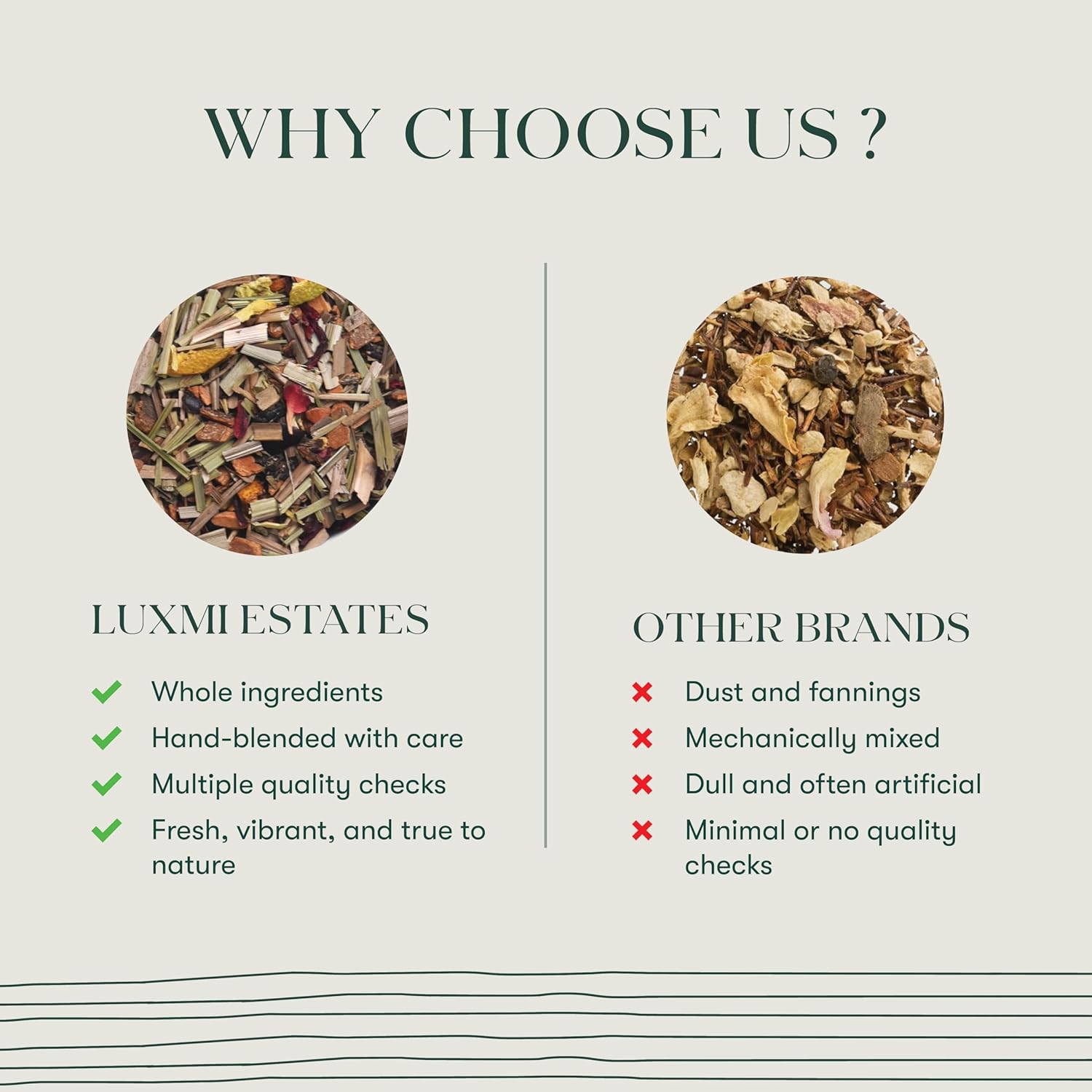 - Uncompromised Quality: At Luxmi Estates, we are committed to delivering an uncompromised quality tea experience. Each ingredient in our Chamomile Honey Herbal Tea is meticulously sourced and blended to perfection, ensuring a consistently delightful taste with every cup.