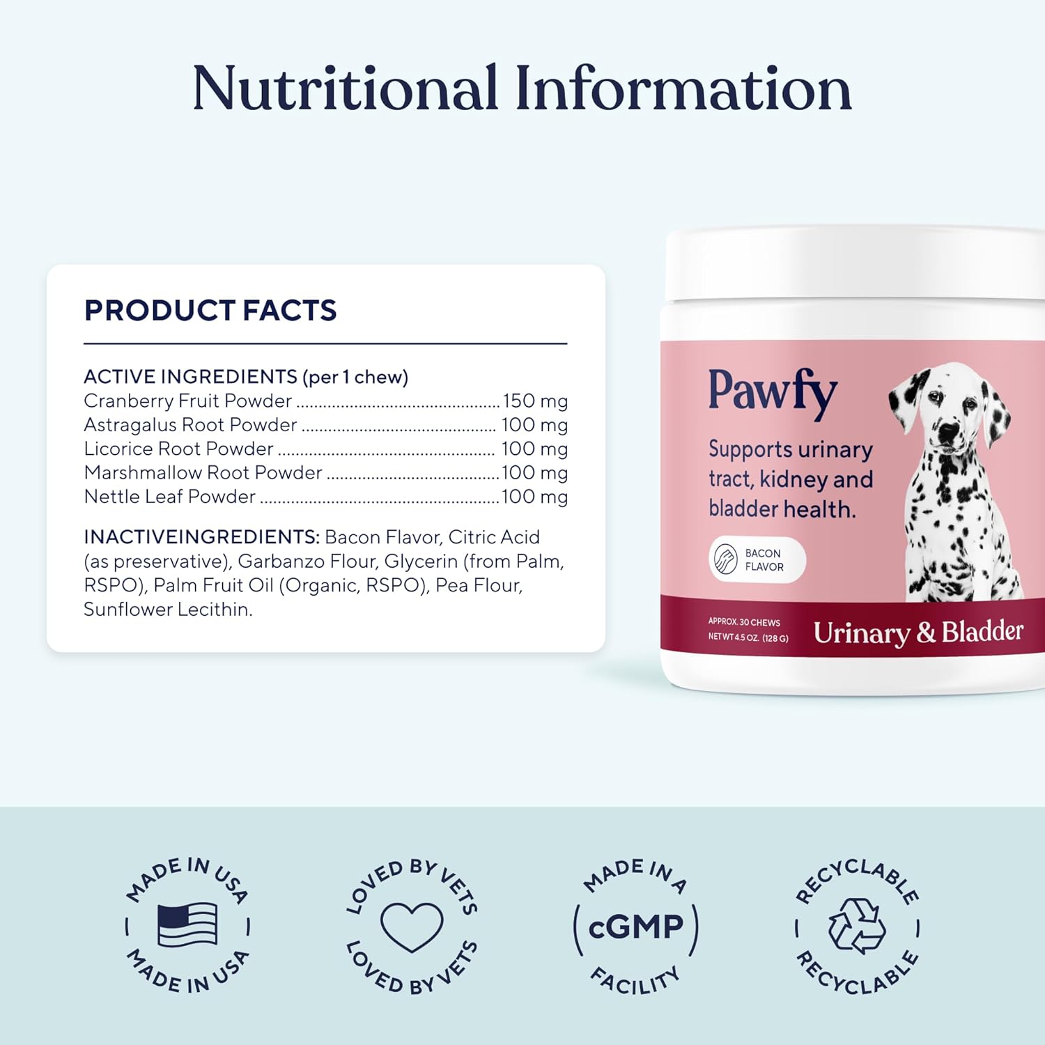 Pawfy Dog UTI Supplement | Cranberry & D-Mannose for Urinary Tract & Bladder Health | Ideal for Senior Dogs | Urinary Tract Infection Control | Dog Vitamins and Supplements - 30 Chews