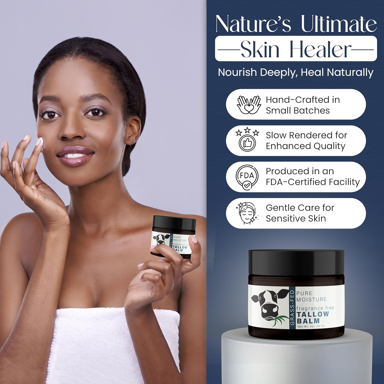 - Powered by Natural Vitamins - Organic beef tallow loaded with skin-repairing vitamins A, D, E & K to hydrate deeply, improve texture, and support natural elasticity.