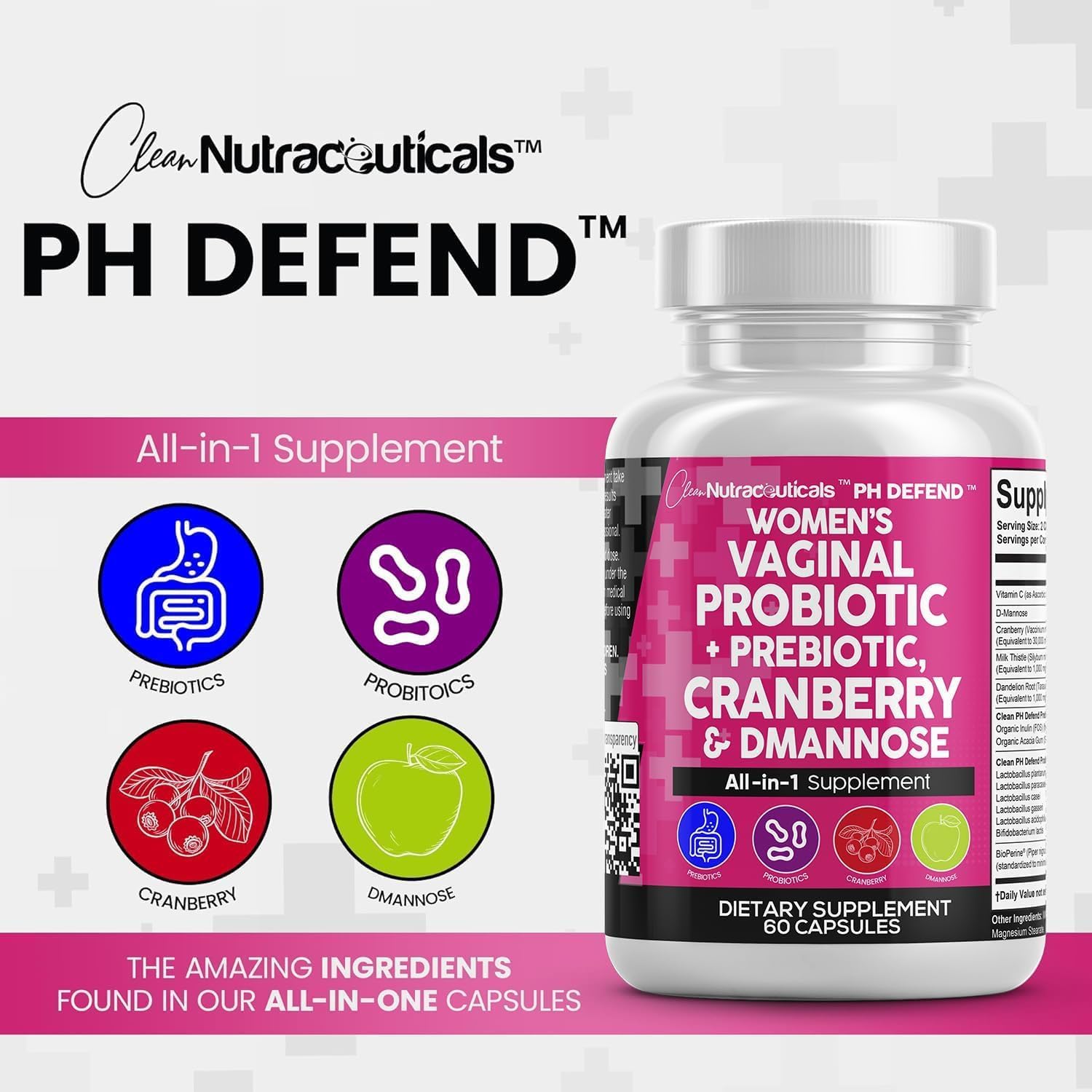 - Comprehensive Women's Health Formula: pH Defend is an all-in-one women's vaginal health formula. With a blend of Probiotics, Prebiotics, Cranberry Extract, and D-Mannose designed specifically for restoring balance in PH and your internal biome. Take 2 capsules of our vaginal health probiotics and experience relief within days.