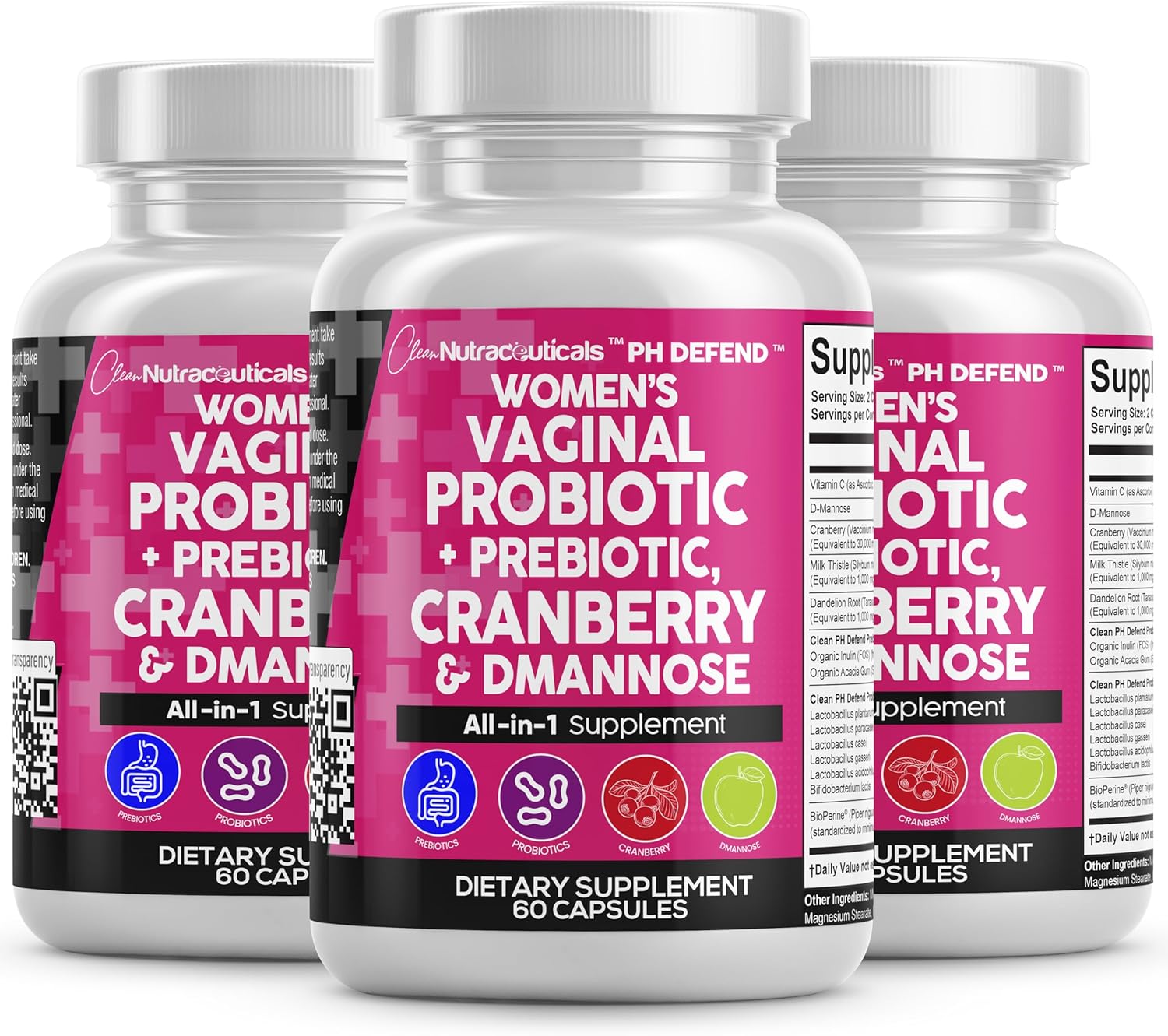 Clean Nutraceuticals Vaginal Probiotics for Women + Prebiotics 20 Billion Cranberry Pills w D-Mannose 500 mg for Urinary Tract Health pH Balance - for Vaginal Health Supplements Pills - 3Pack