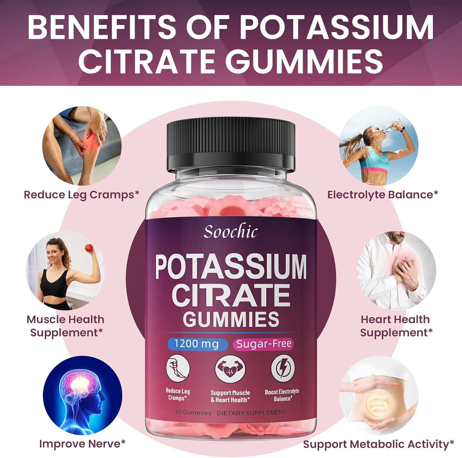- 1200mg Potassium Citrate: Many adults struggle to get enough potassium from their diet. Simply take 2 gummies a day to easily meet your daily requirement of 1200 mg, providing a convenient boost and making it an ideal choice for adults who find it hard to get enough potassium
