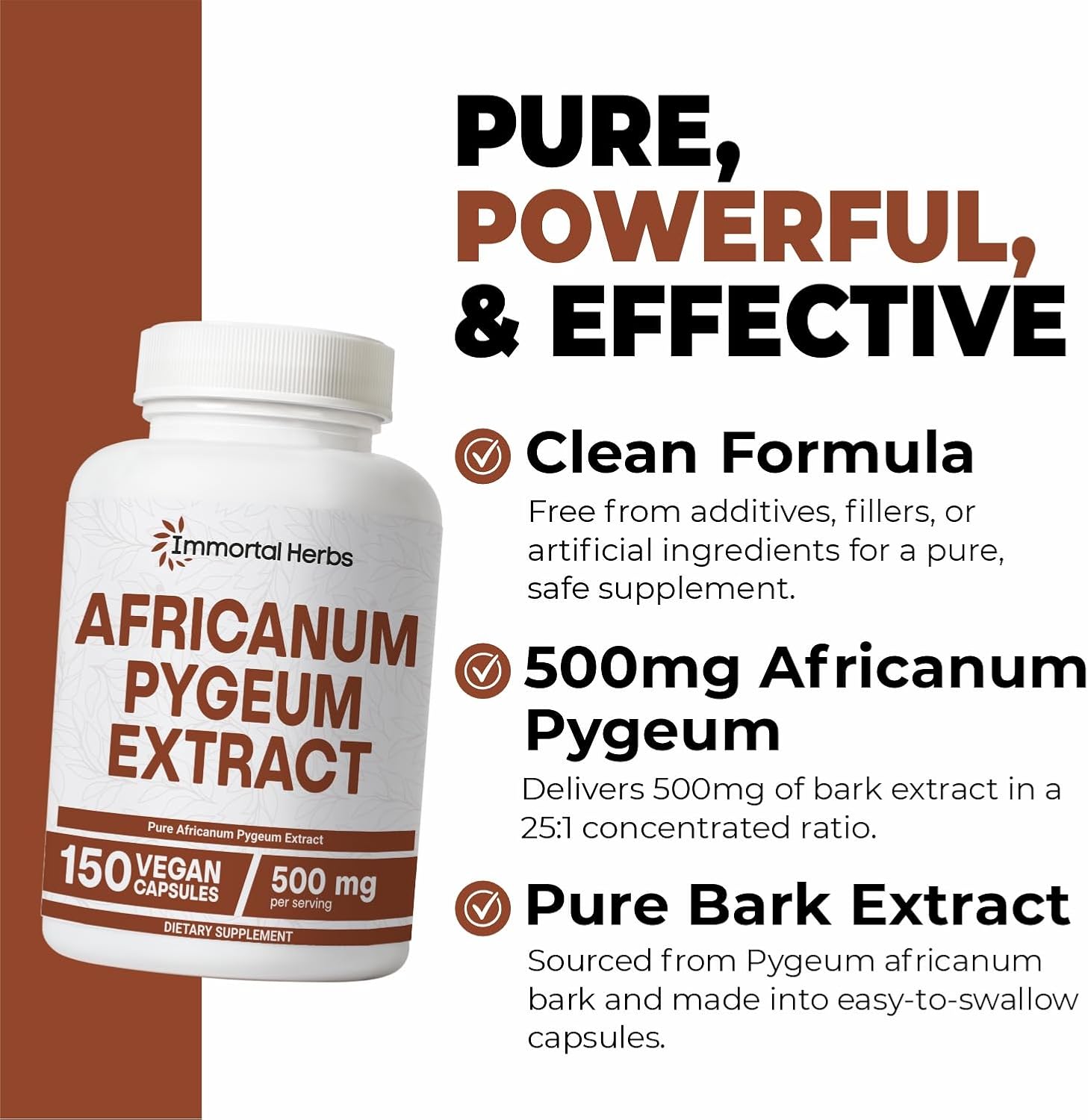 - šæ Inspired by Nature, Backed by Science: At Immortal Herbs, we blend the wisdom of ancient herbal traditions with modern quality practices. Incorporating our pygeum africanum supplement into your daily regimen can be a proactive step toward overall wellness. Discover the natural power of African botanicals and unlock a new level of vitality and resilience with our carefully crafted pygeum extract capsules.