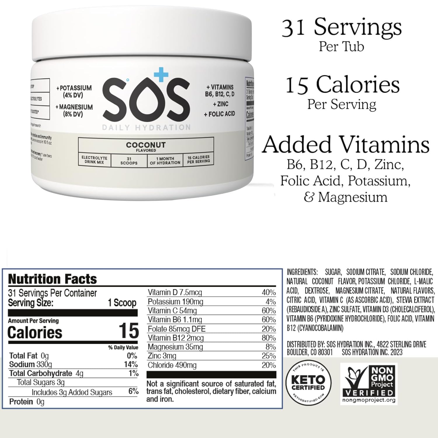 SOS Hydration Electrolyte Powder Drink Mix – Coconut, 31 Servings | Low Sugar Electrolytes, 15 Cal | Keto Hydration Powder for Rapid Rehydration