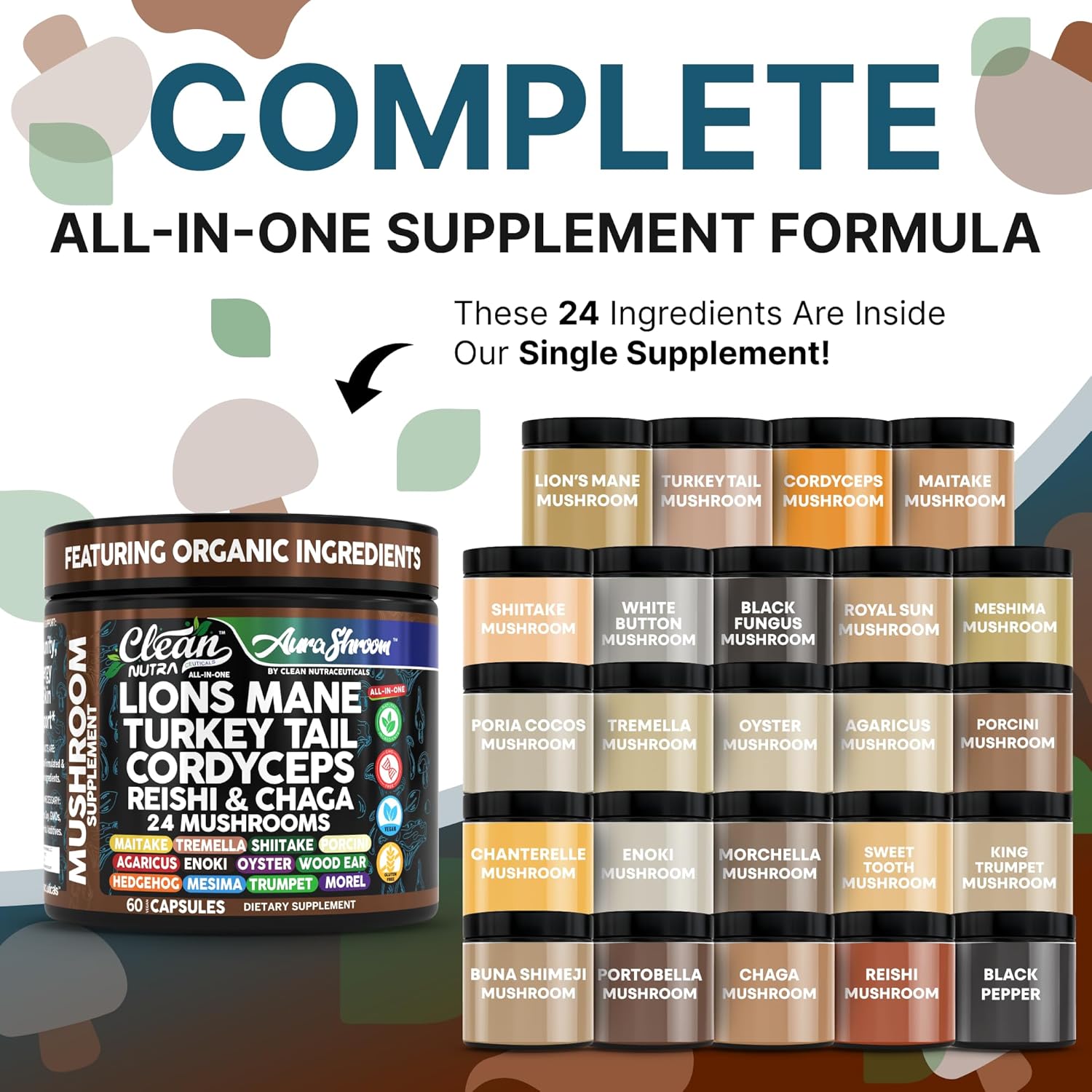 - Mushroom Complex : Condenses centuries of herbal wisdom into a single daily routine with maitake mushroom, turkey tail extract, shiitake mushroom powder, cordyceps extract, chaga mushroom powder, tremella mushrooms, reishi powder, poria cocos, and cordyceps capsules. You can reap the benefits of Aura Shroom adaptogens supplements organic mushroom powder with just 2 capsules a day that provides immunity, mood support, and overall wellness.