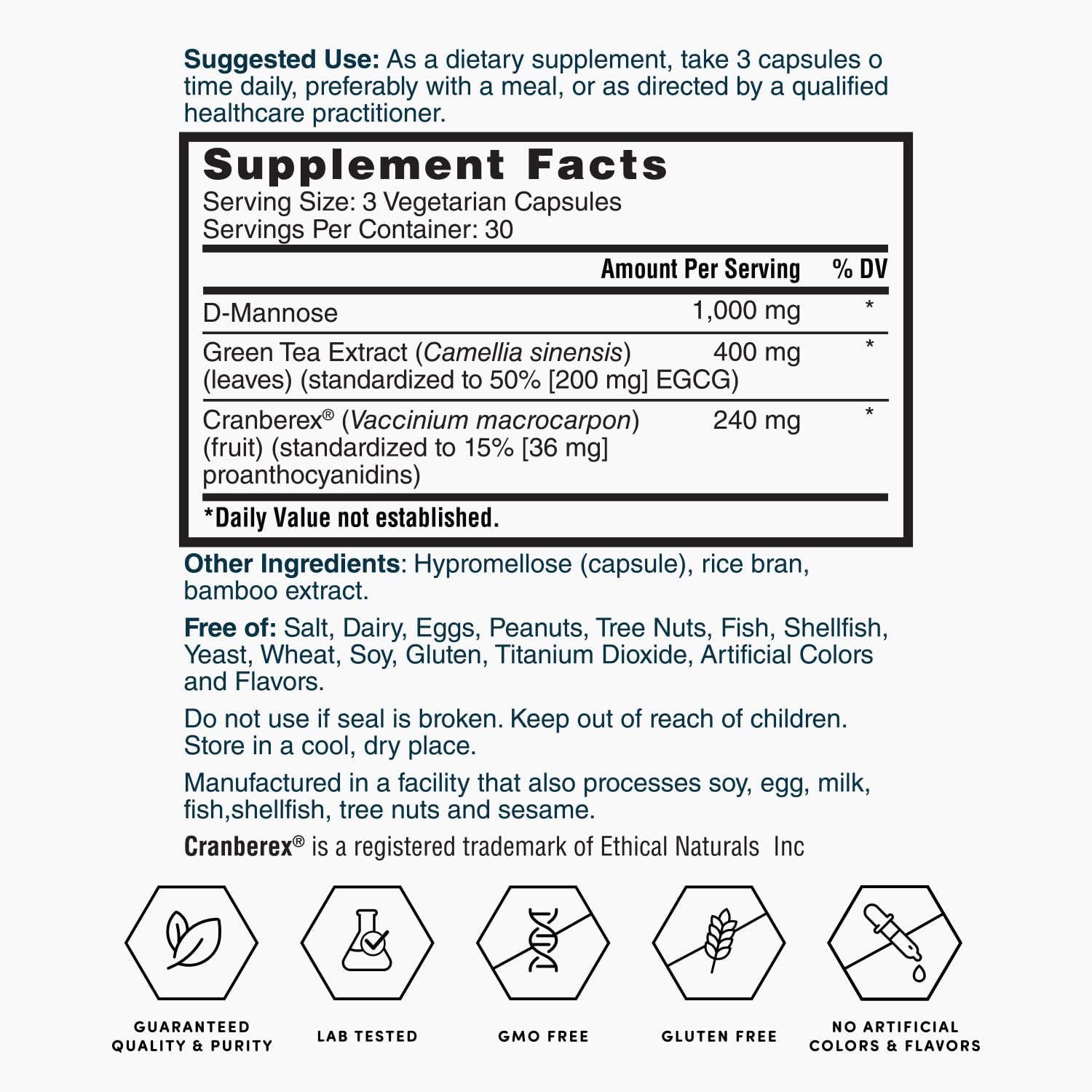 - PREMIUM URINARY TRACT SUPPORT - Combines 1,000mg D-Mannose with 400mg Green Tea Extract and 240mg Cranberex Cranberry Extract to support healthy urinary function and bladder comfort for women's wellness*