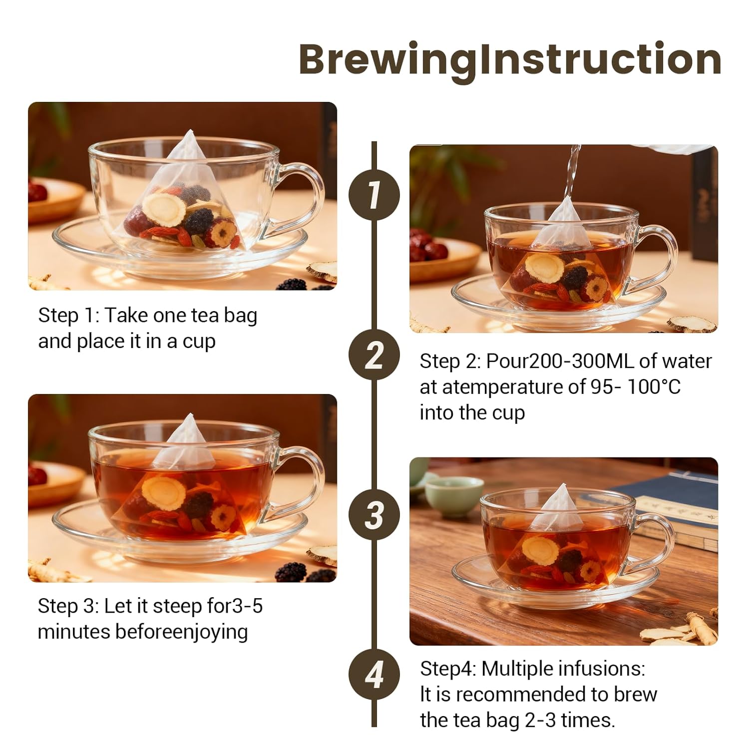 - Rich Flavor & Aroma: Each sip of ginseng 5 treasure tea offers a mellow, deep taste and aromatic richness. Natural sweetness from mulberries, ginseng, red dates, wolfberries, with a rich-hued tea soup. Add honey or rock sugar for extra sweetness