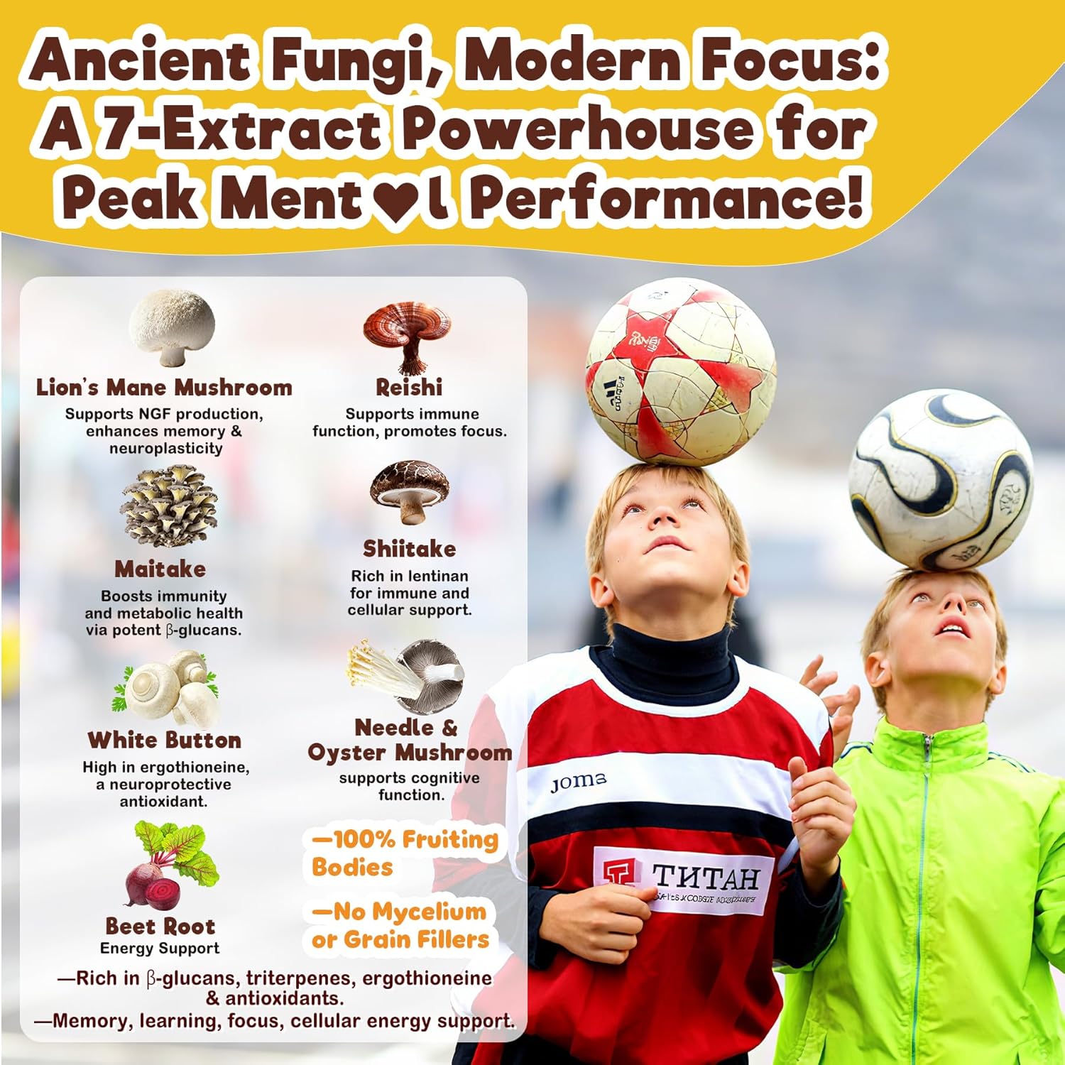 - [Teens Sports & Energy Support: On-Ice Focus & Off-Ice Rec♥very] Dominate your game and your grades. The mushroom supplement is Game Changer for sports and classroom. Lion's Mane and Phosphatidylserine synergize to help with focus for split-second game-time decisions and post-game study sessions. B-Vitamins convert your food into clean, natural energy to power through demanding days. Meanwhile, Reishi and crucial Vitamin D3 work behind the scenes to help your body maintain overall well-being.