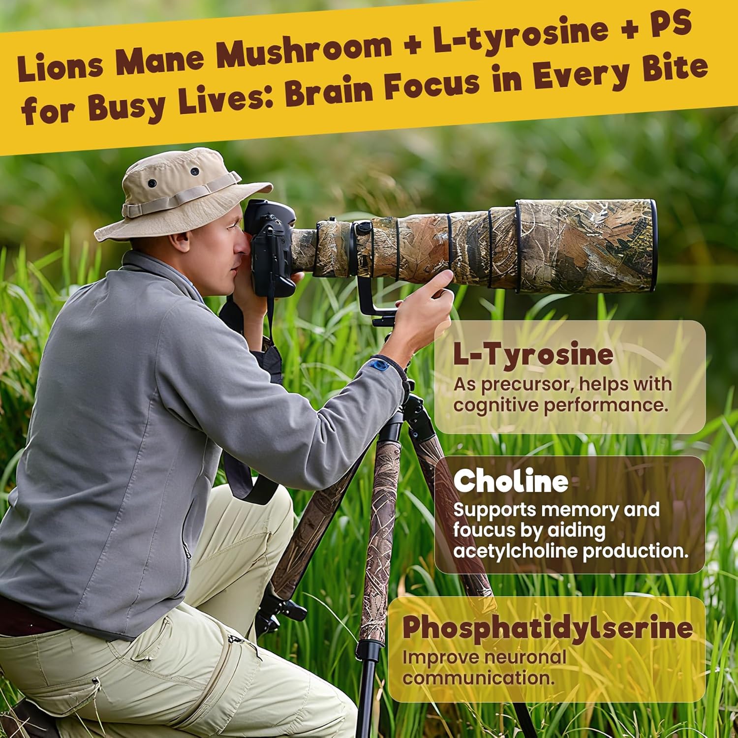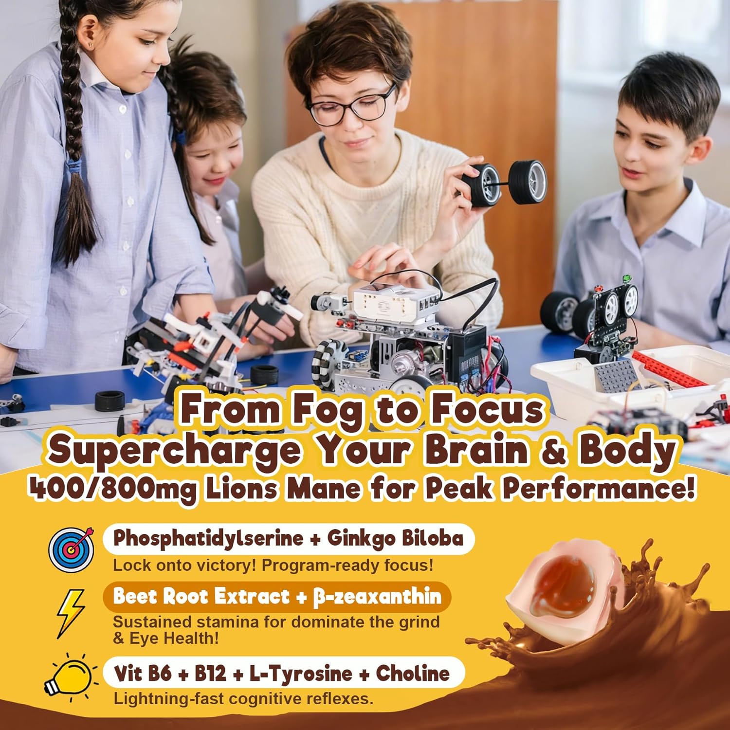 - [Your Brain's Button for Learning & Curiosity.] Studying feel like a struggle? Presentation tomorrow? Struggling to maintain concentration through long lectures? Your brain is your most valuable asset—give it the elite support it deserves. Our mushroom gummies feature Lion's Mane for cognitive health, w/ L-Tyrosine, Choline, Phosphatidylserine, Ginkgo Biloba Leaf. This powerful duo is designed to help with ment✿l cl✿rity and focus, so you can stay on task and absorb more information naturally.