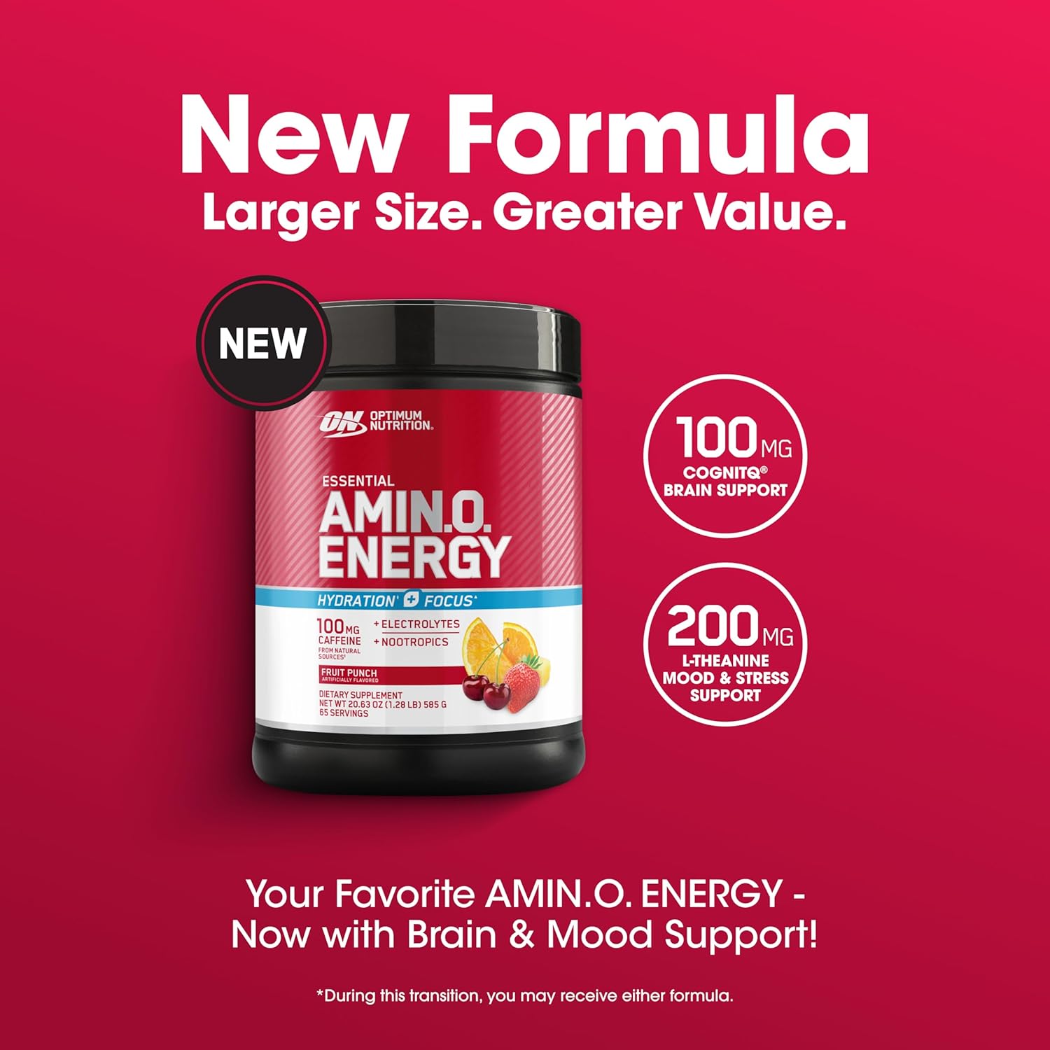 Optimum Nutrition Amino Energy Powder Plus Focus, with BCAA, Electrolytes, and Caffeine, Fruit Punch, 65 Servings (Packaging May Vary)