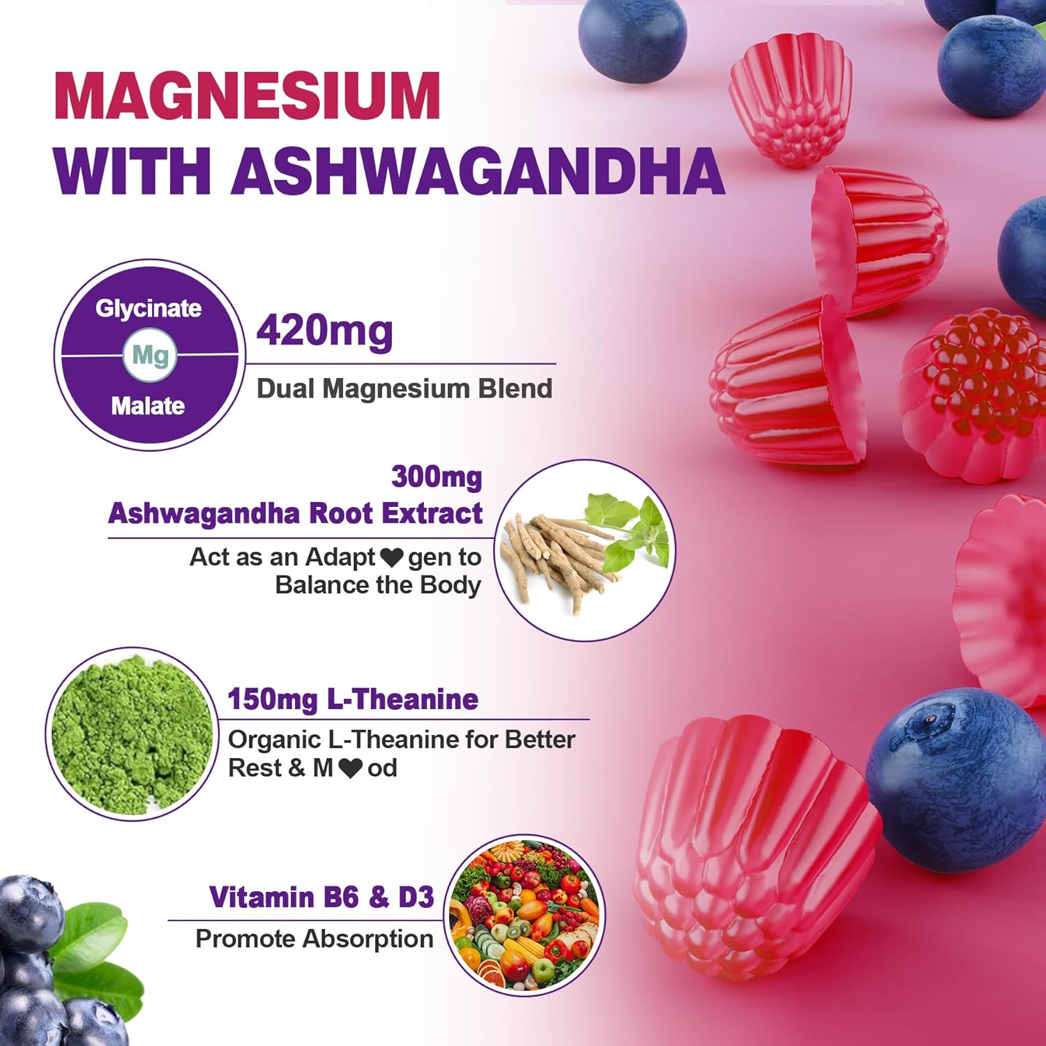 Magnesium Glycinate Gummies 420mg for Adults, Sugar Free Magnesium Supplement with Malate, Ashwagandha, L-Theanine, Vitamin D3 & B6 for Brain Calm, Bone Health & Sleep Support, 120Cts